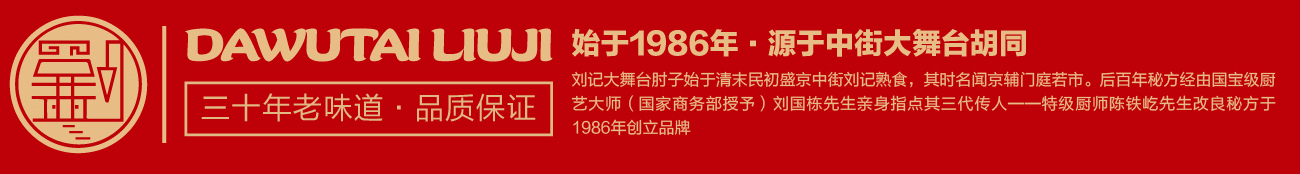 品牌創始人陳鐵屹先生自幼師承遼菜正宗,以發揚傳承遼味為己任。1986年,陳鐵屹先生經師傅指導調制出第一鍋醬湯,自此開始制作熟食,并于市井銷售,食客絡繹不絕。作為中華美食的傳承者、開拓者和創新者,陳鐵屹先生于80年代創立“劉記大舞臺肘子”品牌,開出了第一家門店。基于百年秘方傳承改良,并采用新鮮放心原料,秘用二十幾味名貴藥材,延用傳統工藝專心加工而成,形成了色澤艷麗,酥爛脫骨,肥而不膩,瘦而不柴的風味產品。